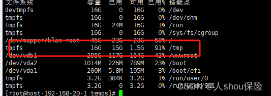 1. 通过 df -h 查看磁盘占用,发现/dev/vdb1 (文件存放路径)占用42%,空间充足;但是/tmp 文件夹占用率100%;